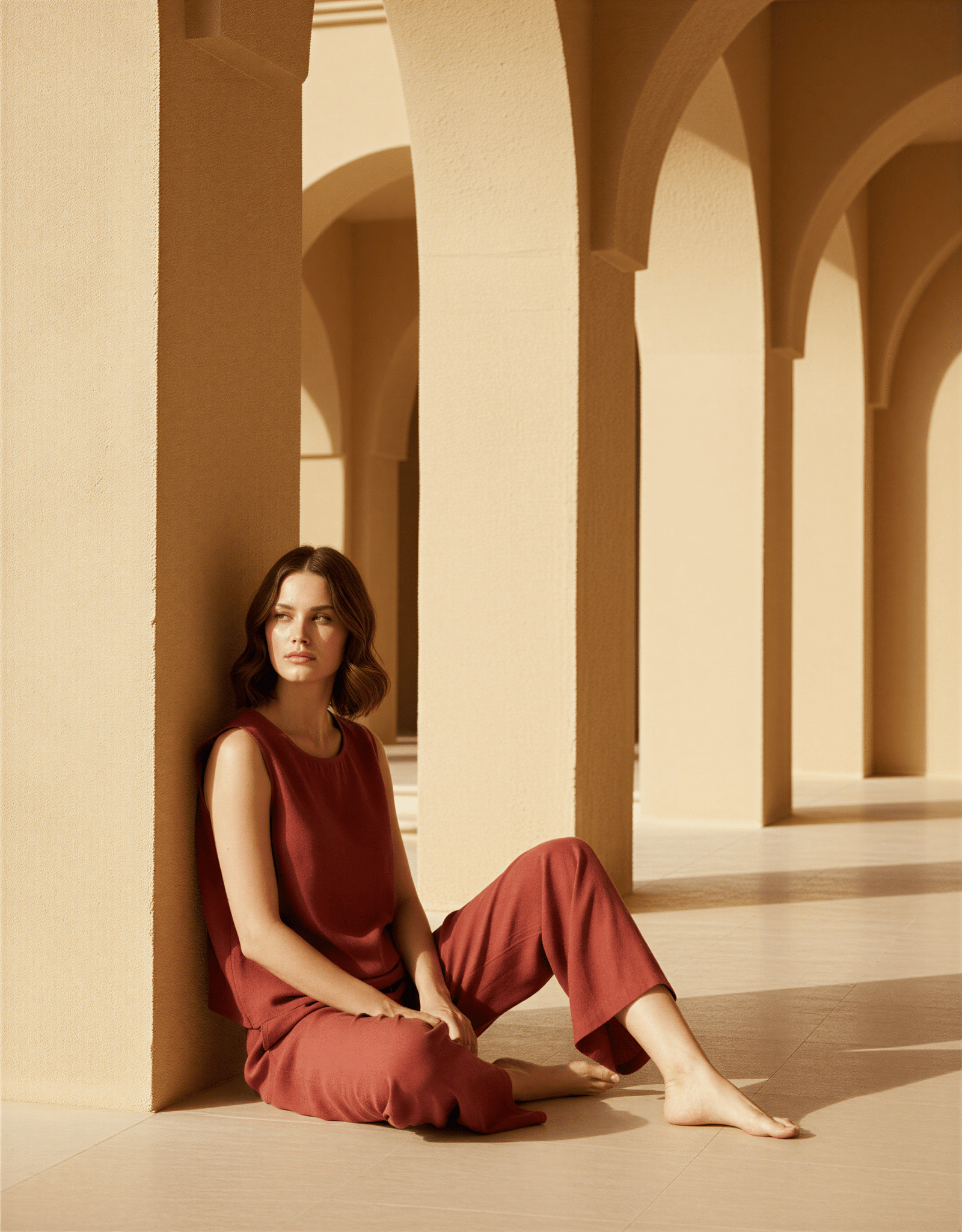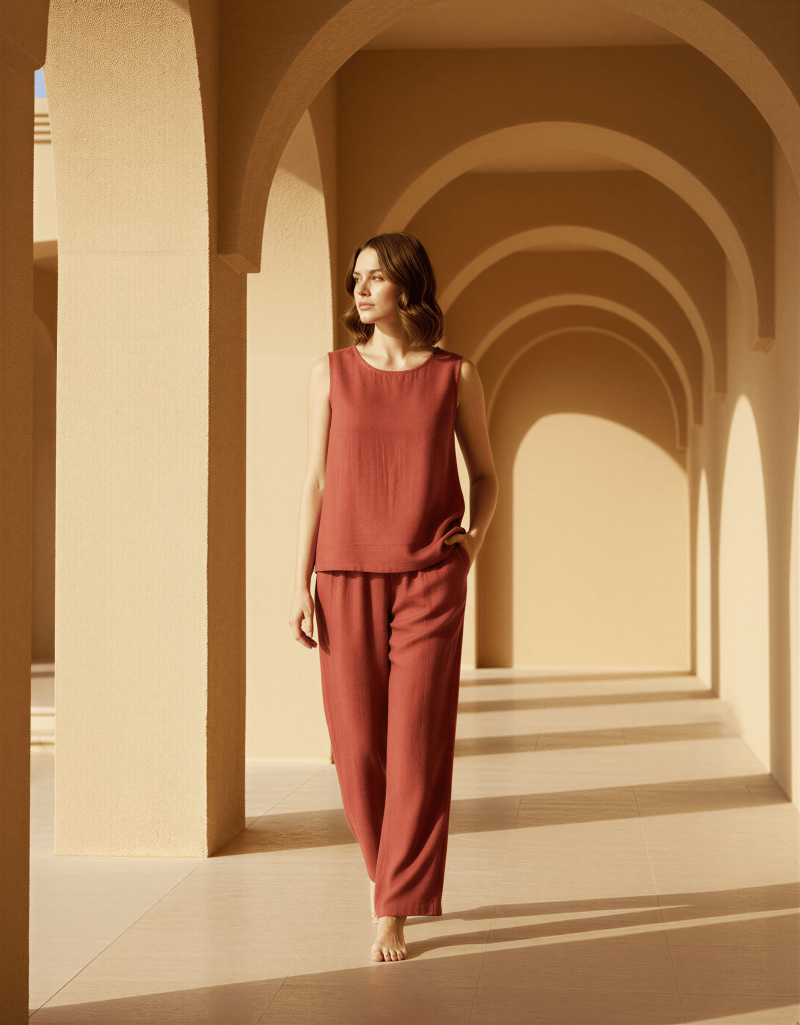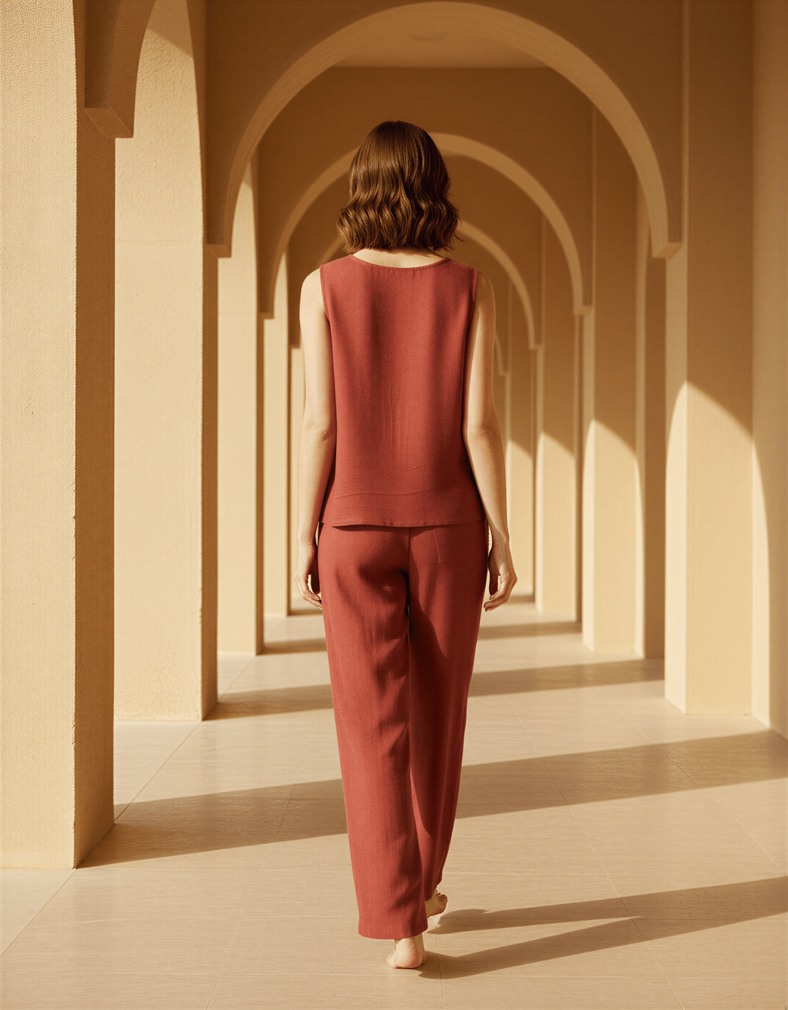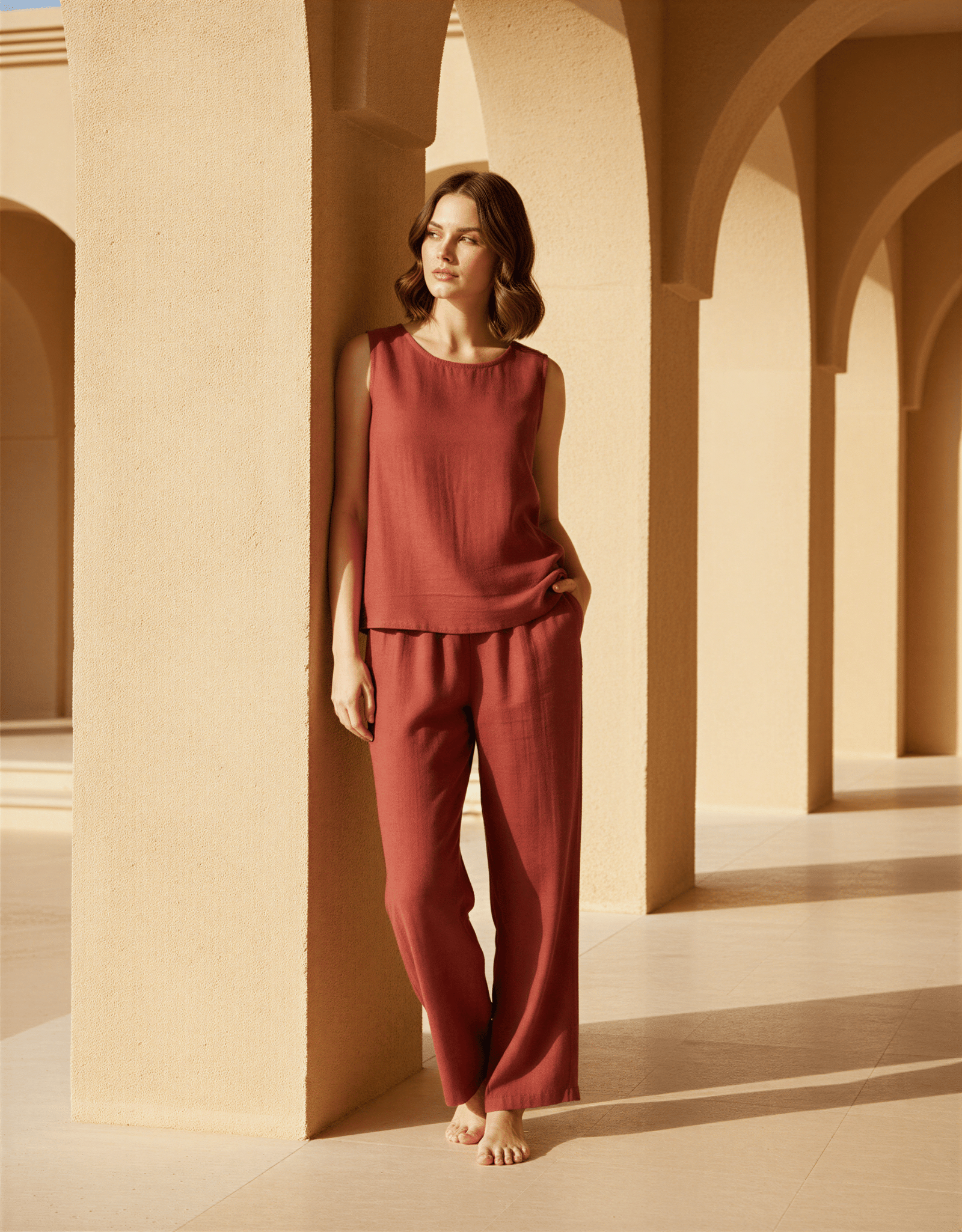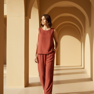 Yumuşak dokulu, nefes alan kumaşıyla gün boyu konfor sunarken; terrakota tonunun sıcaklığı doğadan ilham alan bir zarafet yaratır.